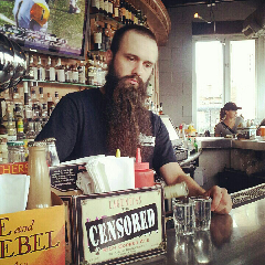 we posted at the bar because of the 45 minute wait but enjoyed the view of a bartender with one of the greatest beards i've ever seen. the bloody mary's here are fresh & superb - hefty garnishes join the tasty beverage; mine had gin and shrimp and elena's had salami, cheese and pickles. and for the perfect finish, you get a beer back too. once we were seated, we ordered their fat boy sandwich (a.k.a burger) and although i can finely manage a burger all on my own, i was full from the bloody's and didn't stand a chance with the burger. had a few bites though and it was wonderful.